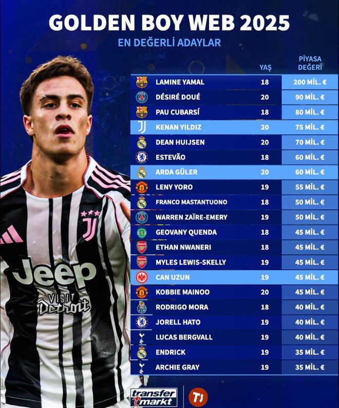 雷速体育10月29日讯 2025年金童奖的投票正在进行中,德国转会市场列出了今年金童奖候选人的身价排名,其中巴萨新星亚马尔以2亿欧元的身价高居榜首,而皇马队内有3人进入这份榜单的前10,尤文前锋伊尔迪兹排名第四,切尔西的埃斯特旺和曼联的约罗也都入围前10。