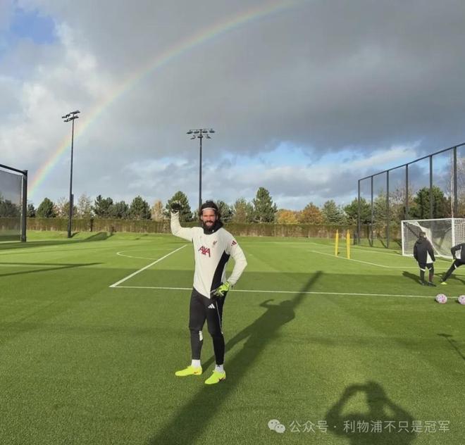 阿利森今天晒出一张自己在训练场的照片,希望空中的那道彩虹能预示着利物浦即将挺过最近这段艰难的时刻。