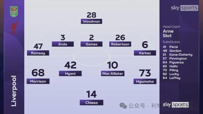 今天的阵容和上周末对布伦特福德相比,首发只保留了科尔克兹1人,再加上戈麦斯、远藤航、罗伯逊、基耶萨、麦卡利斯特、恩古莫哈这6位最近出场机会不多的一线队球员,其余是第三门将伍德曼,以及3位小将拉姆塞、莫里森、尼奥尼。